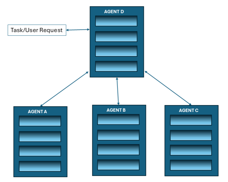 In the example above Agent D is acting as the orchestrator of the process, this is one form of collaboration. But there are other patterns for collaboration, each with pros and cons.